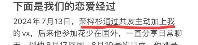 两人在2024年7月相识,当时是荣梓杉主动要求加联系方式,要知道当时荣梓杉已经“红遍半边天了。”